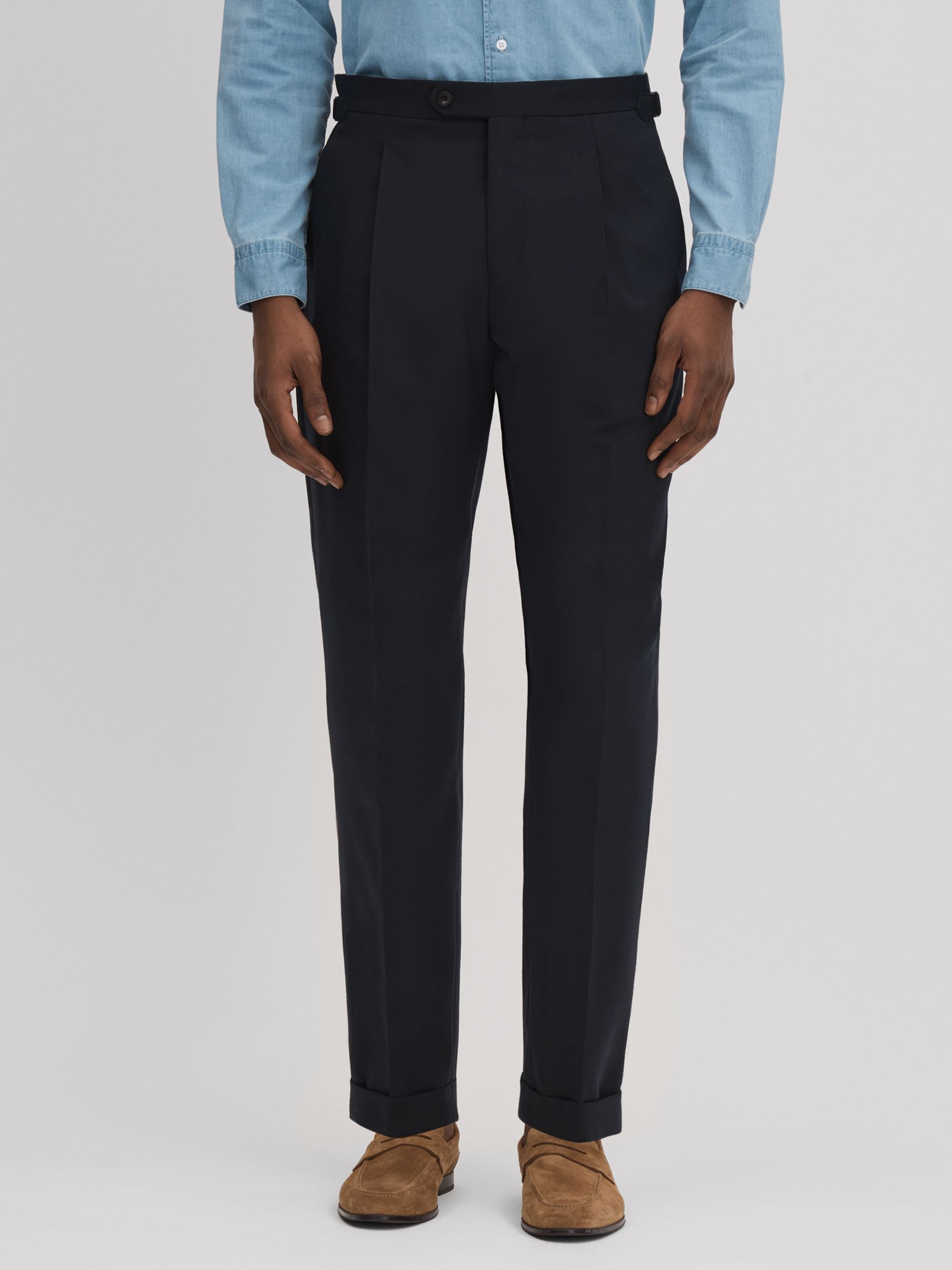 Slim Fit Wool Blend Trousers with Turn-Ups in Navy
