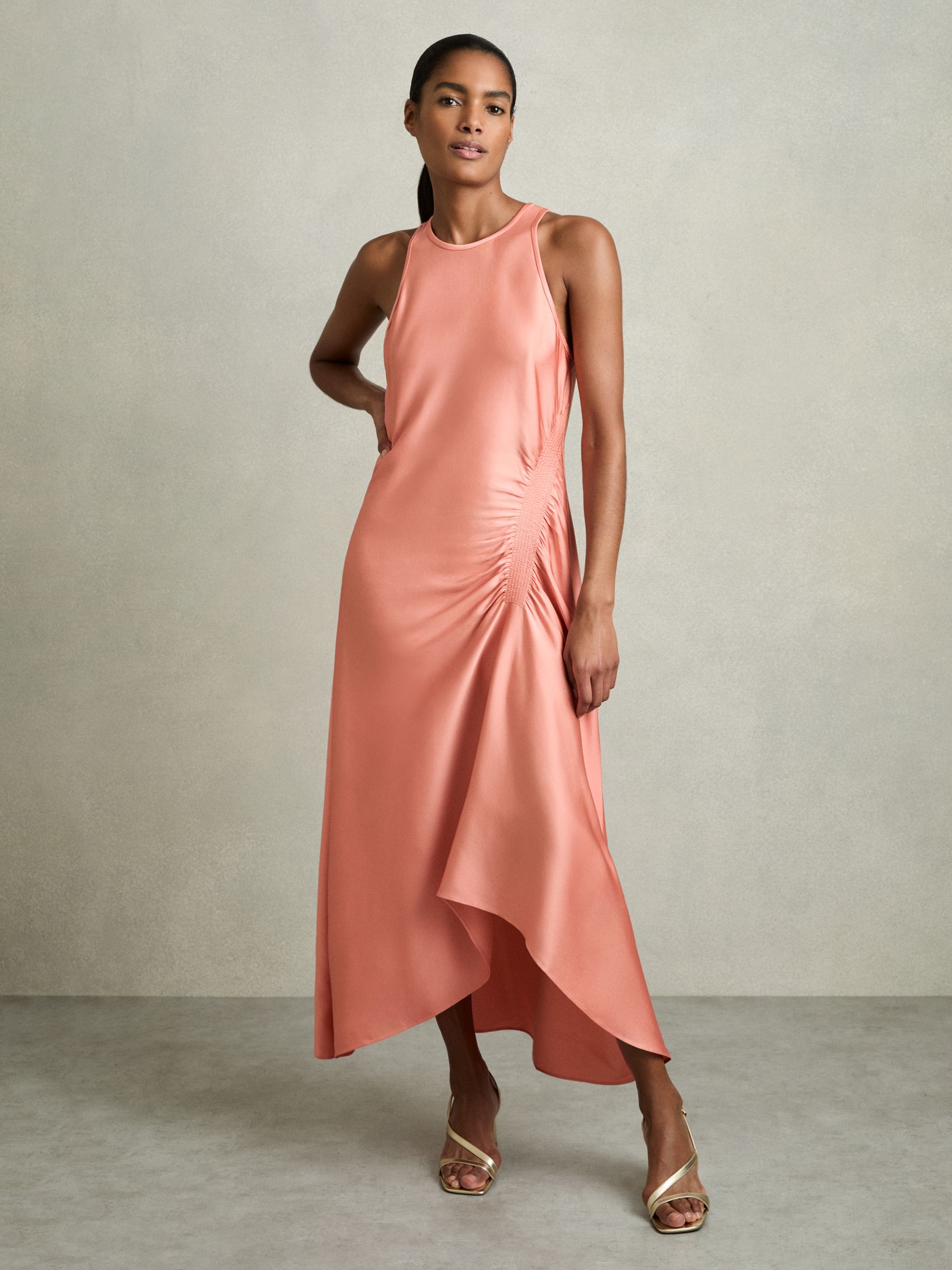 Petite Satin Shirred Midi Dress in Coral