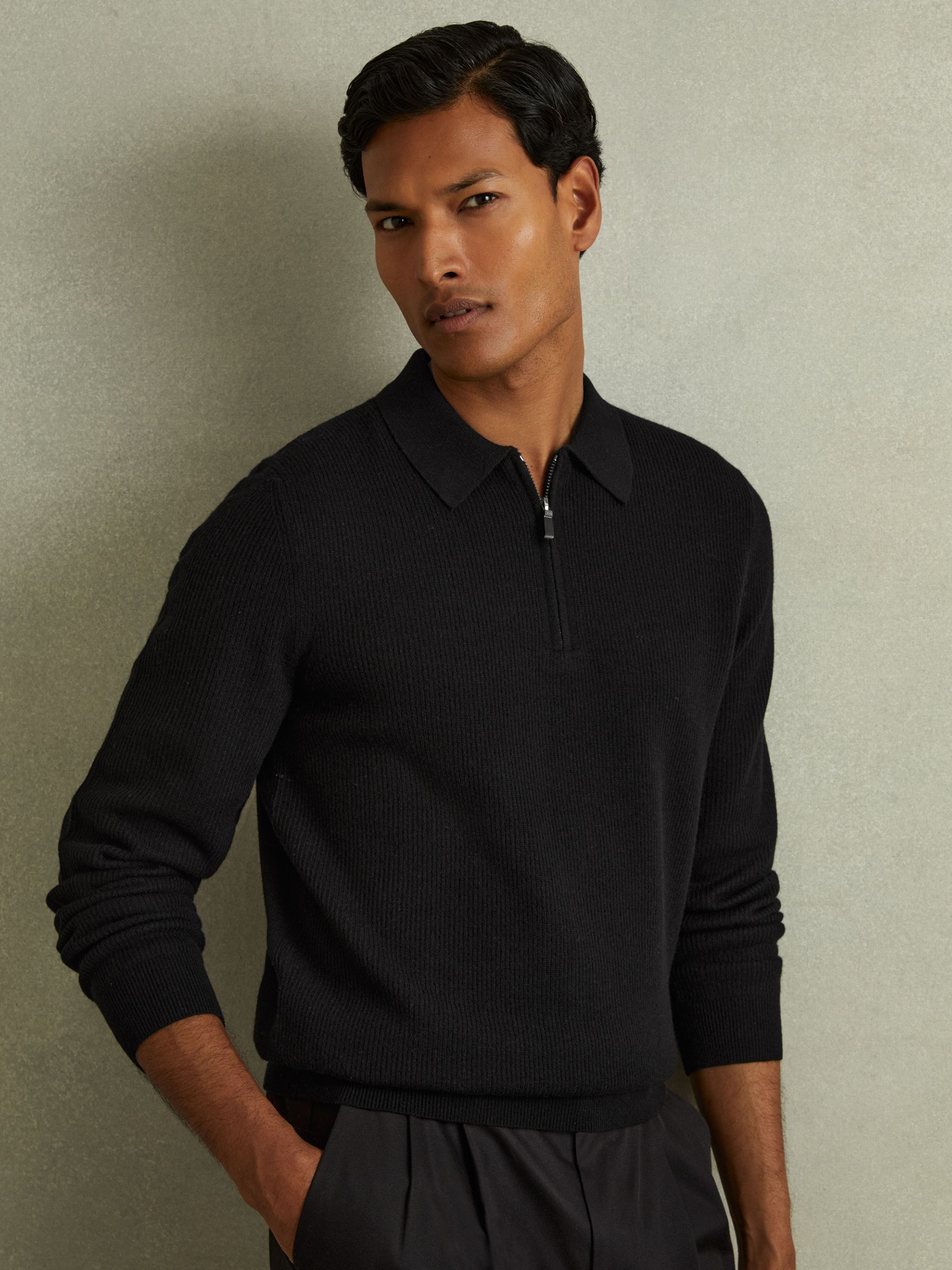 Wool Half-Zip Polo Shirt in Black