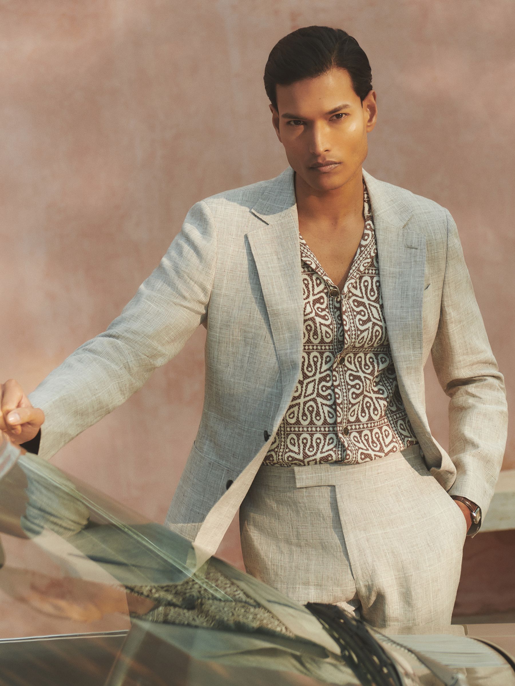Geometric Jacquard Cuban-Collar Shirt in Tobacco Brown/Navy