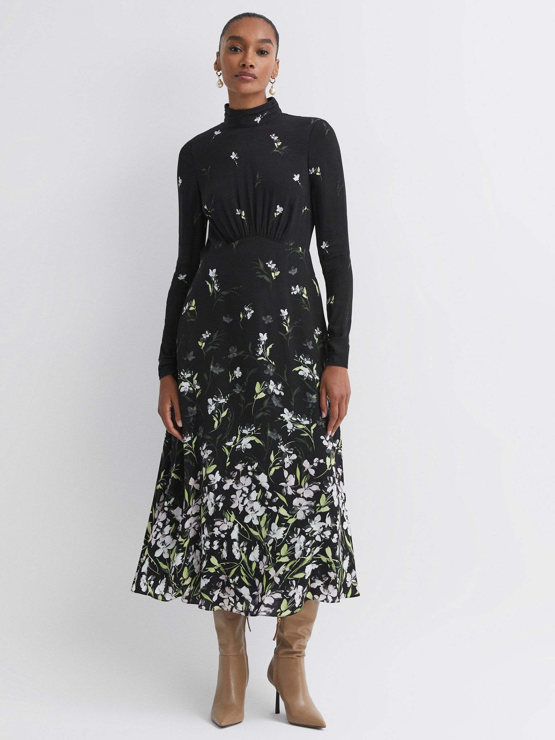 Florere Floral High Neck Midi Dress in Black