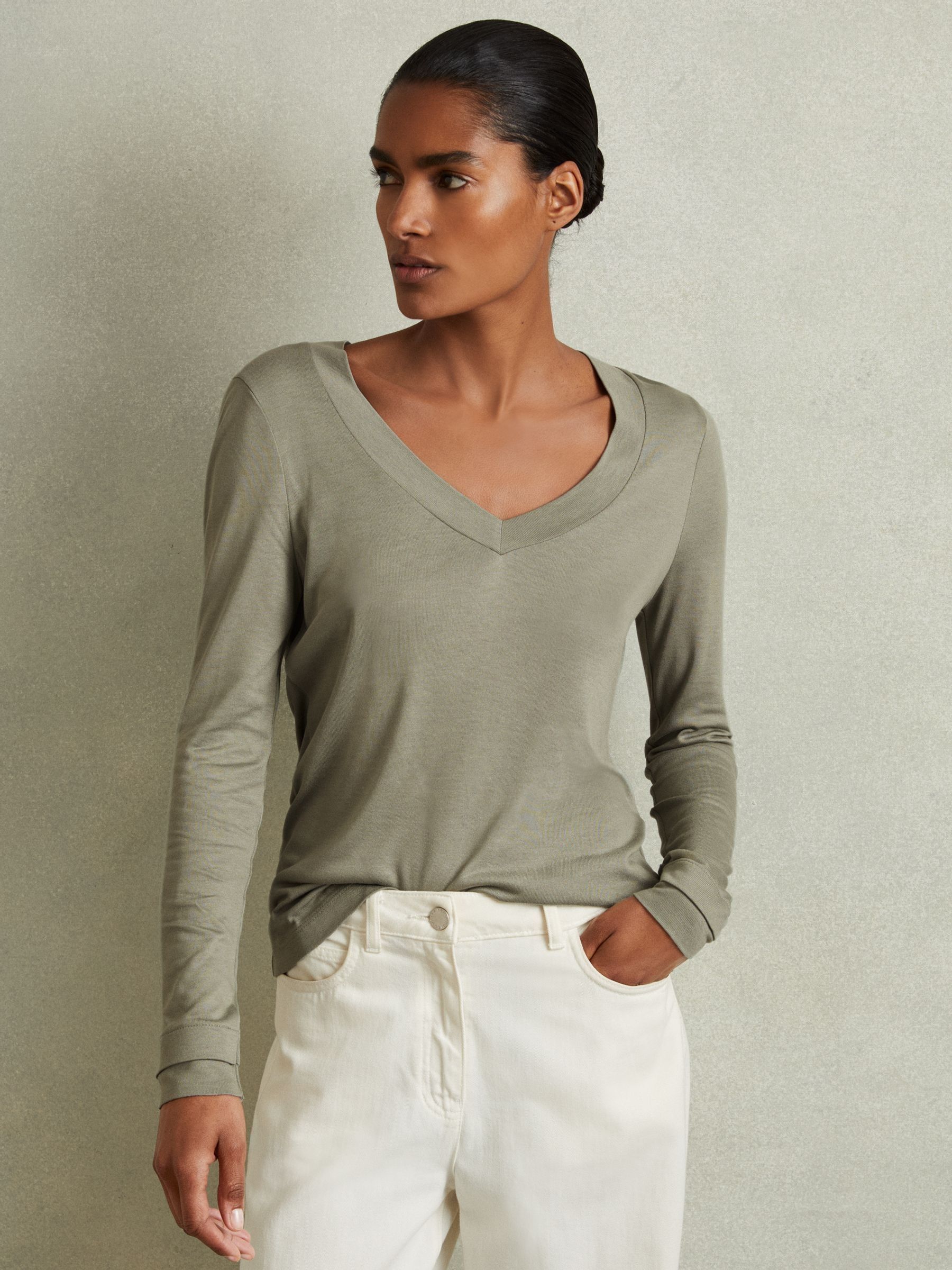 Stretch Cotton V-Neck T-Shirt in Khaki Green