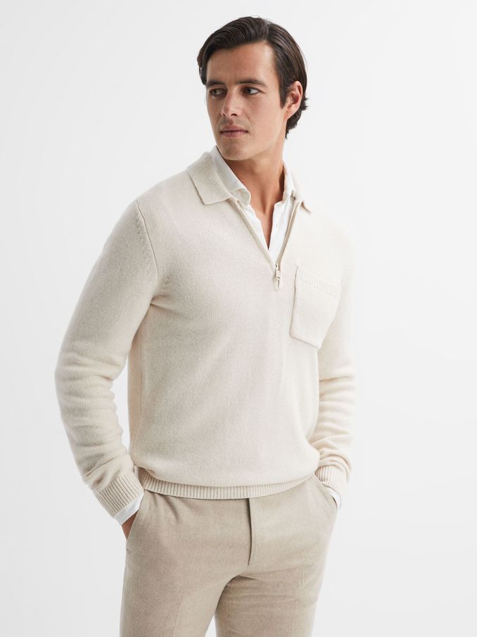 Wool Blend Half-Zip Polo Jumper in Ecru