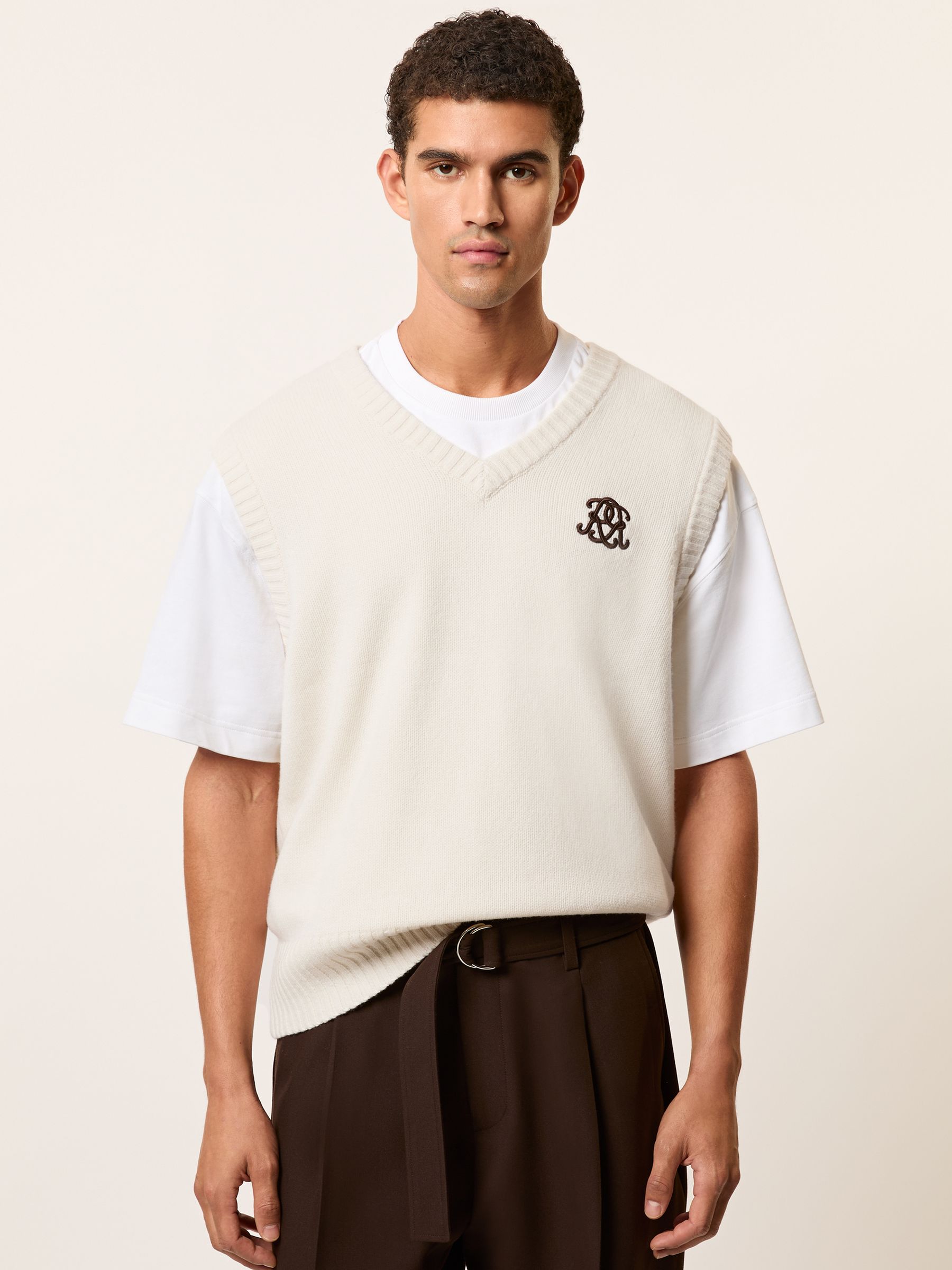 Monogram Embroidered Relaxed Wool Vest in Off White