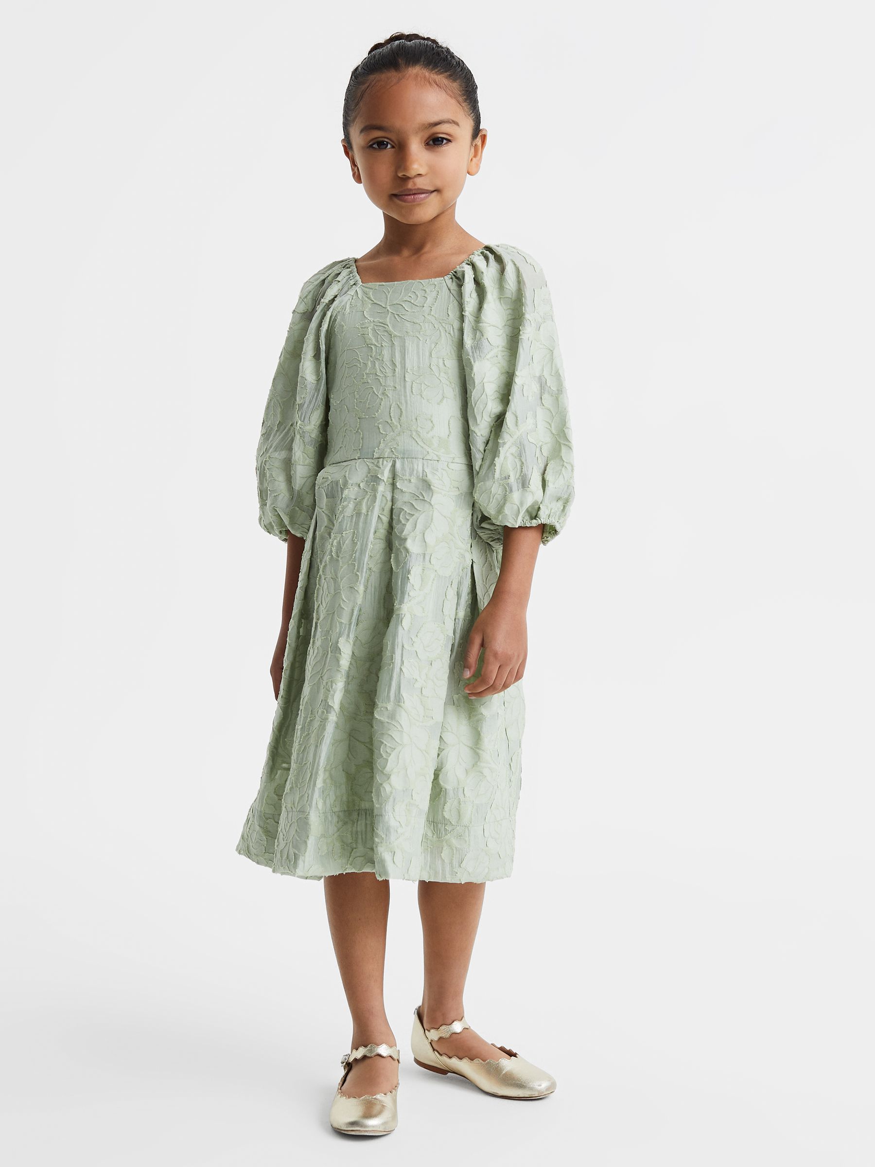 4-9 yrs Jacquard Puff Sleeve Dress in Sage