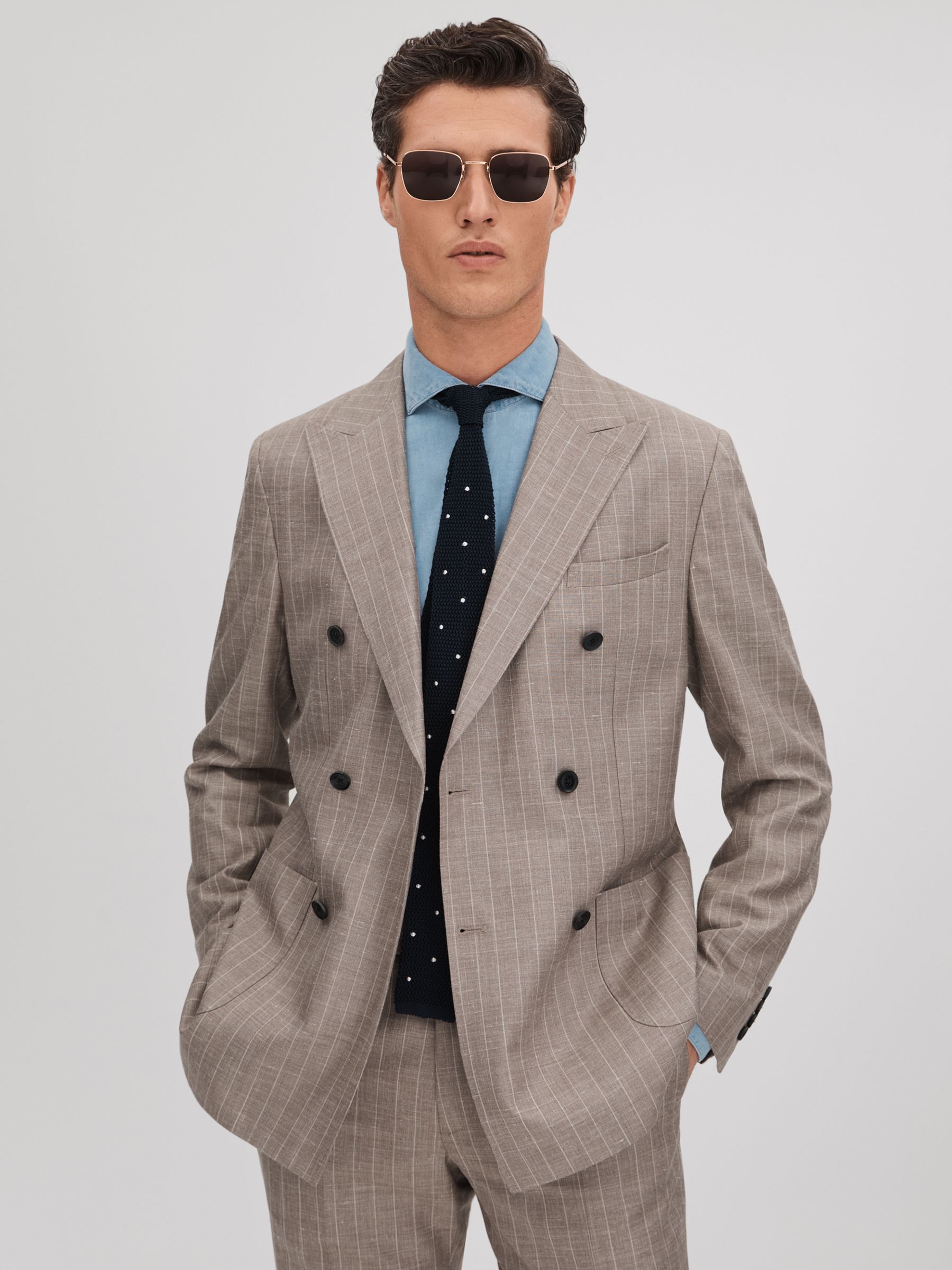 Slim Fit Wool-Silk-Linen Double Breasted Blazer in Mocha