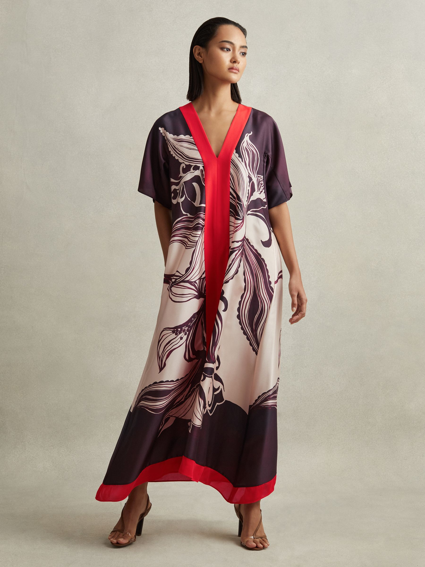 Designed from a fluid fabric in an abstract print, the Hanna dress falls naturally in a trapeze shape, with a front split and split sleeves adding extra movement. Printed V-Neckline Split sleeves Front split Self-tie waist belt Midi length The model is wearing a size 8. Measurements of model: Height 5ft 10'' / 178cm. Regular side neck to hem 51.5" / 131cm.