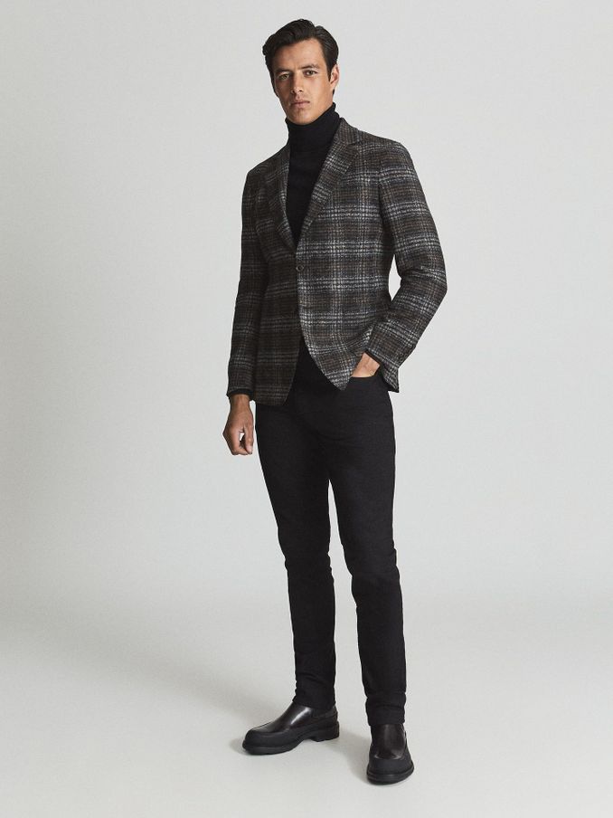 Wool Blend Checked Slim Fit Blazer in Charcoal Grey