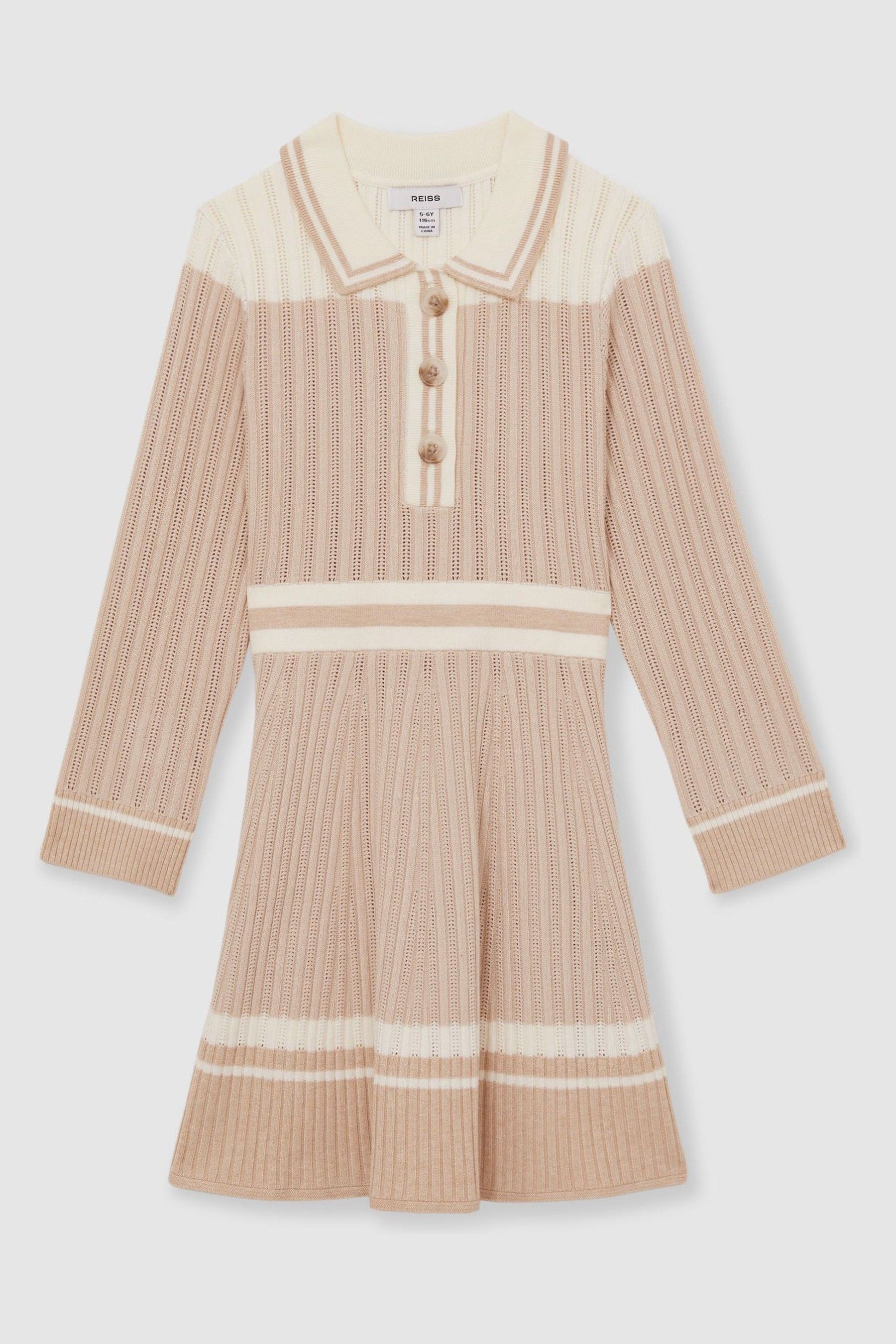 The Colette dress is crafted from a ribbed, pointelle knit for a textured finish. Contrasting stripes add a bold touch, whilst the polo collar with a button placket gives it a sporty vibe. The flared skirt completes the look with a playful finish. Ribbed, pointelle knit Contrasting stripes Polo collar with button placket Long sleeves Flared skirt Country of Origin: Great Britain