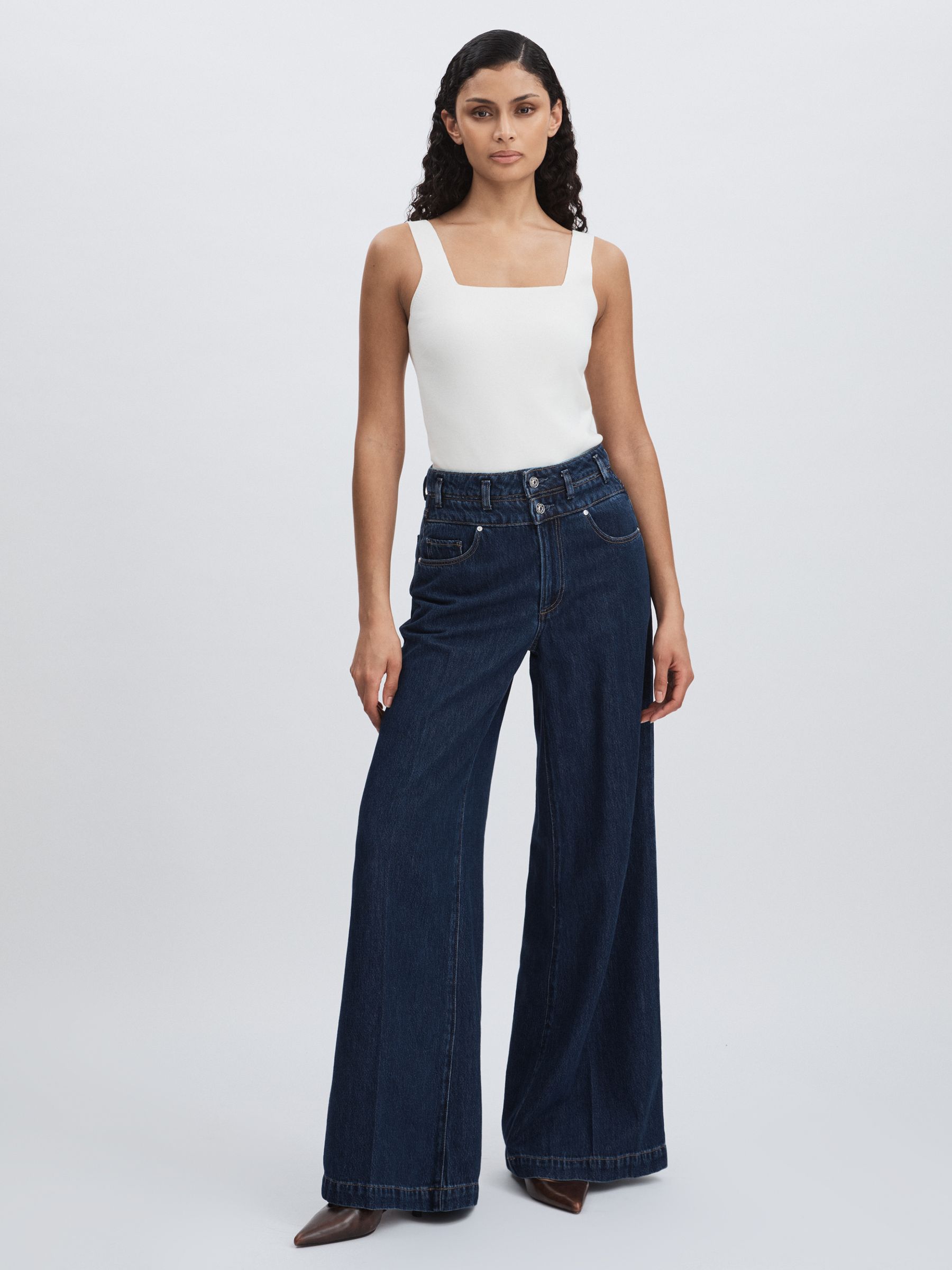Paige Double Waistband Wide-Leg Jeans in Navy Blue