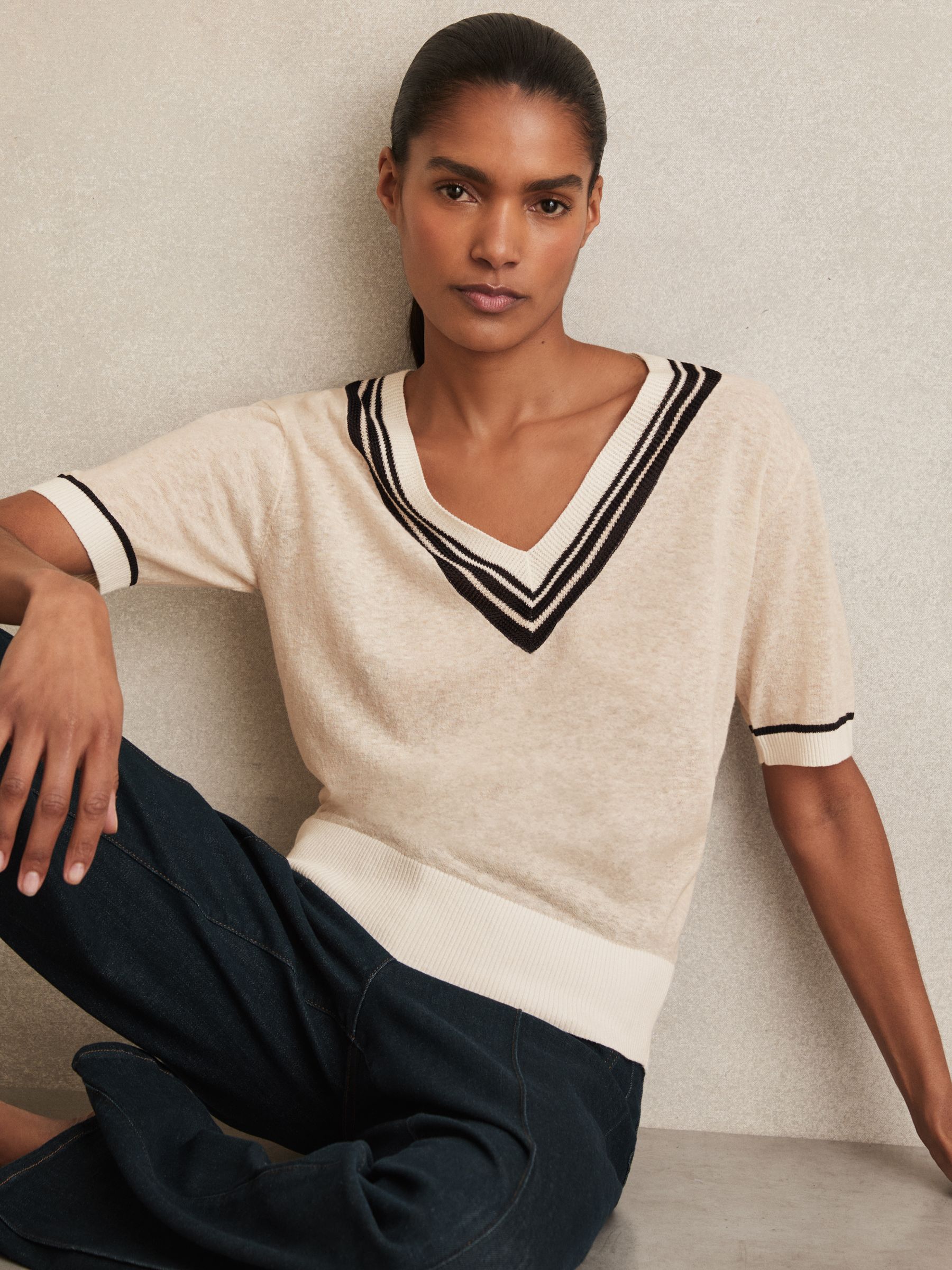V-Neck Fine-Knit Cricket Top with Linen in Neutral