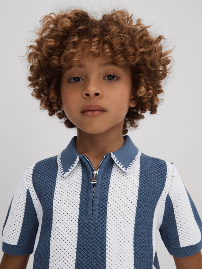 9-13 yrs Knitted Striped Half-Zip Polo Shirt in Airforce Blue/Ecru