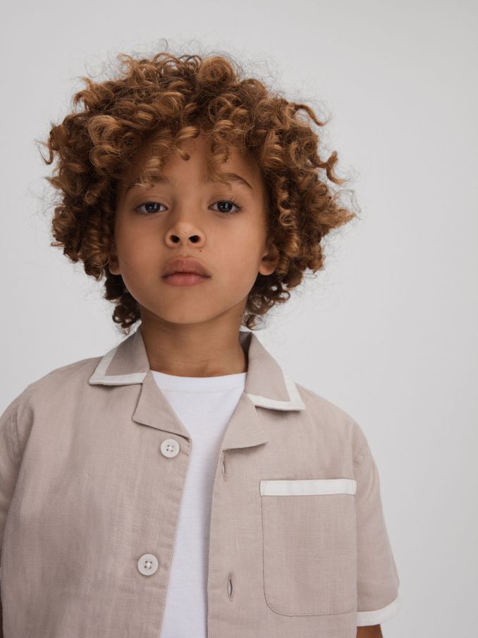 3-9 yrs Linen Contrast Cuban Collar Shirt in Stone/White