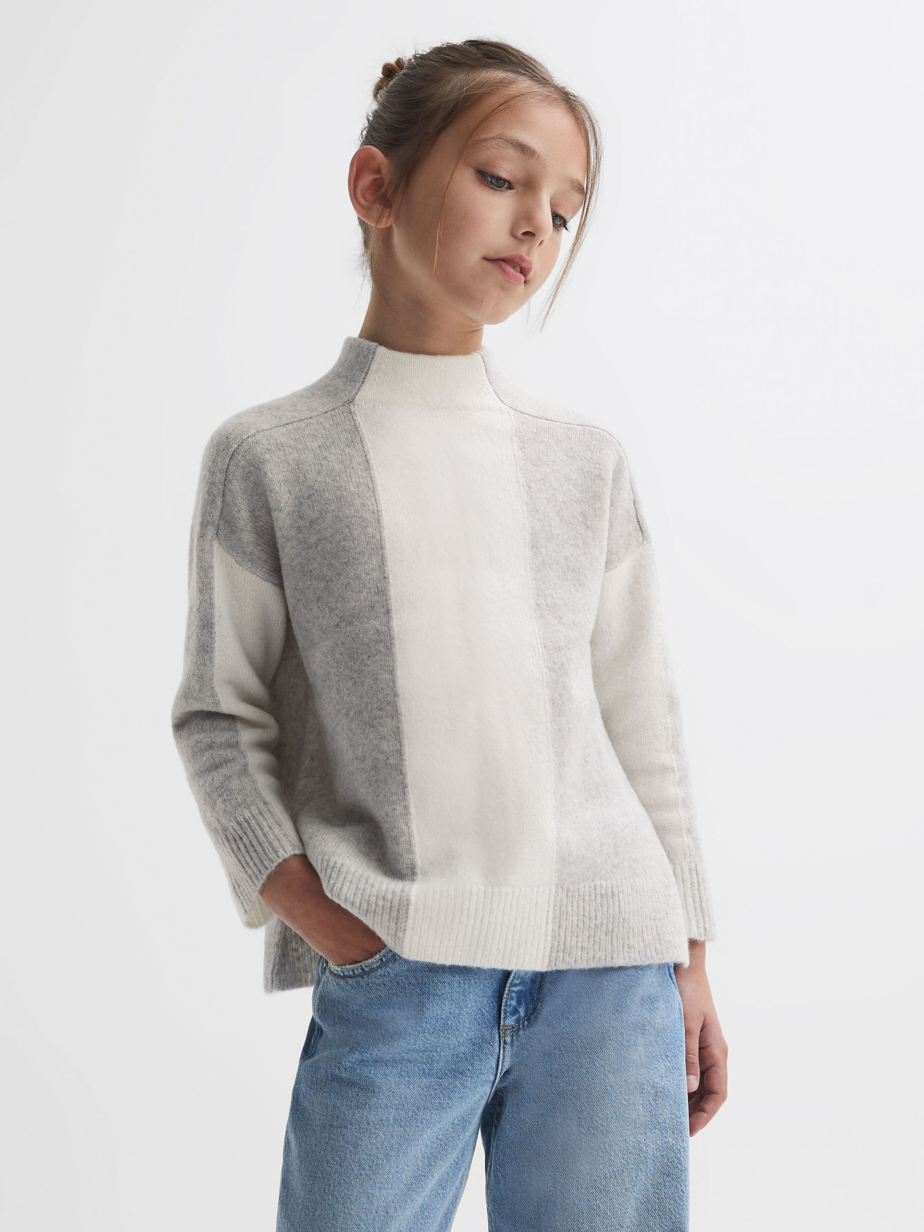 4-9 yrs Funnel Neck Striped Jumper in Grey/White
