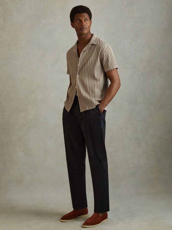 Ribbed Striped Cuban Collar Shirt in Sand/Navy