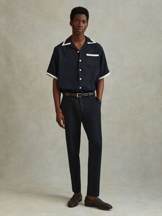 Contrast Trim Cuban Collar Shirt in Navy/Ecru