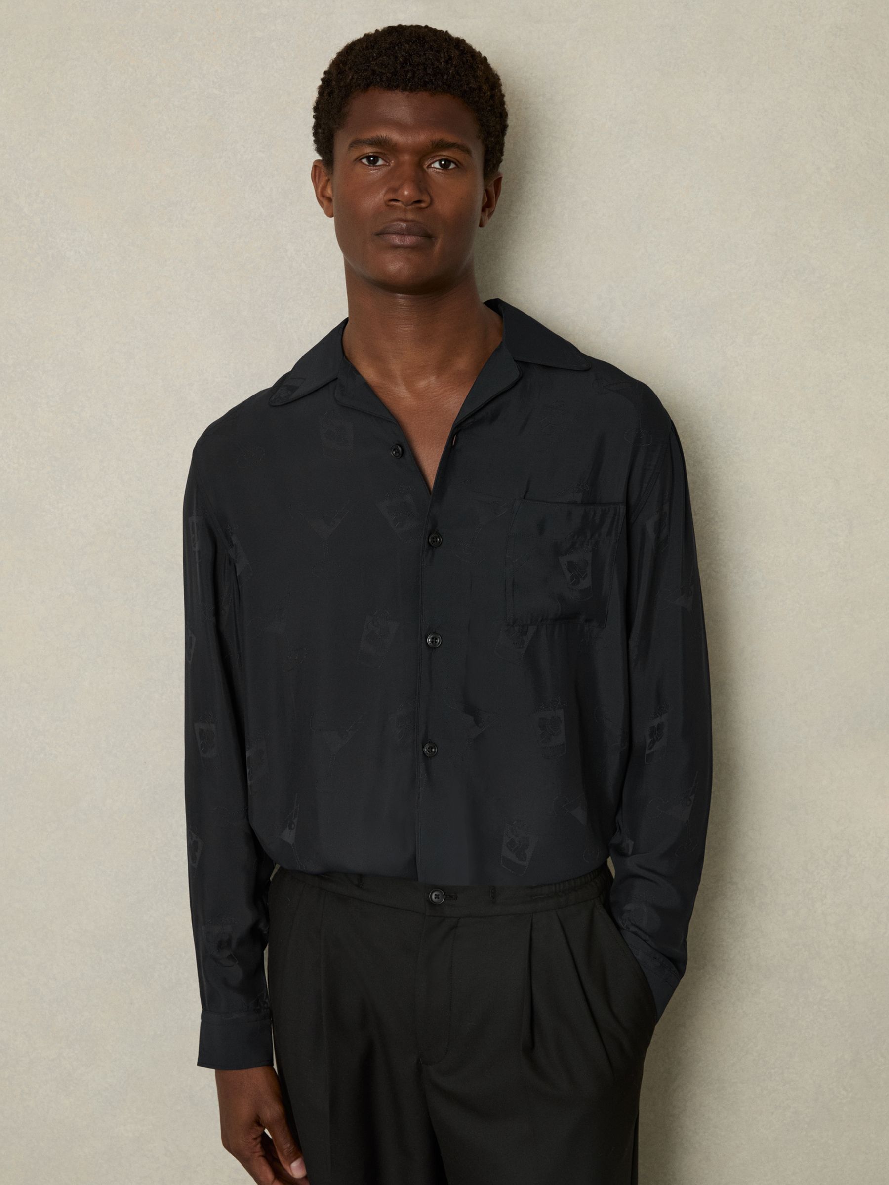 Herringbone Twill Cuban Collar Short Sleeve Shirt in Black