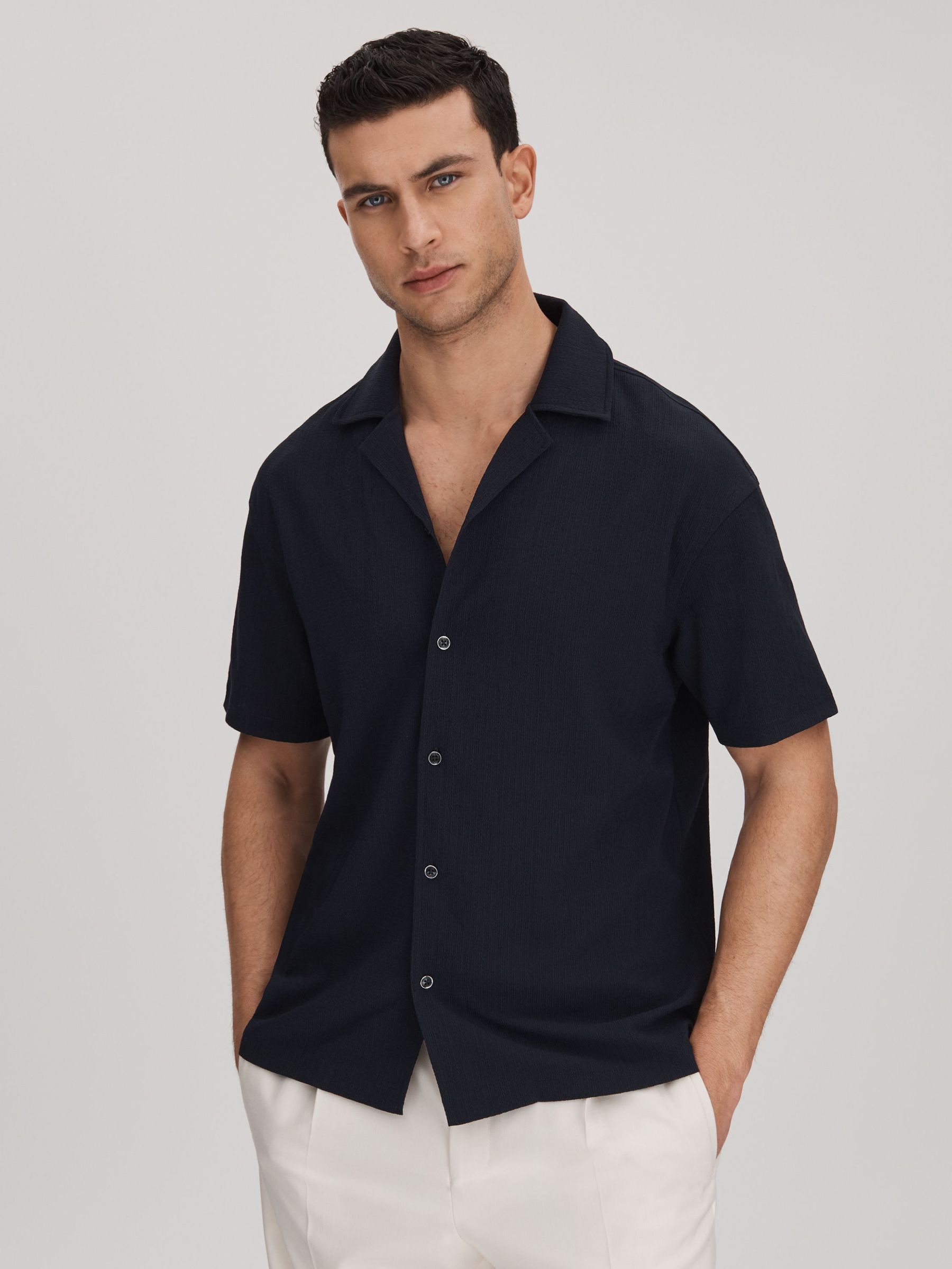 Textured Crepe Cuban Collar Shirt in Navy