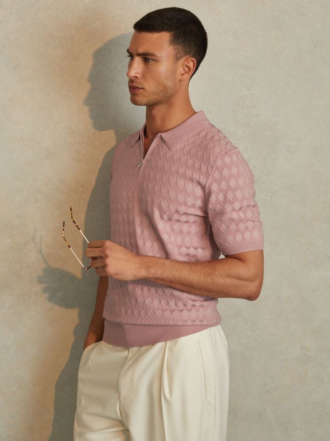 Half-Zip Knitted Polo Shirt in Soft Pink