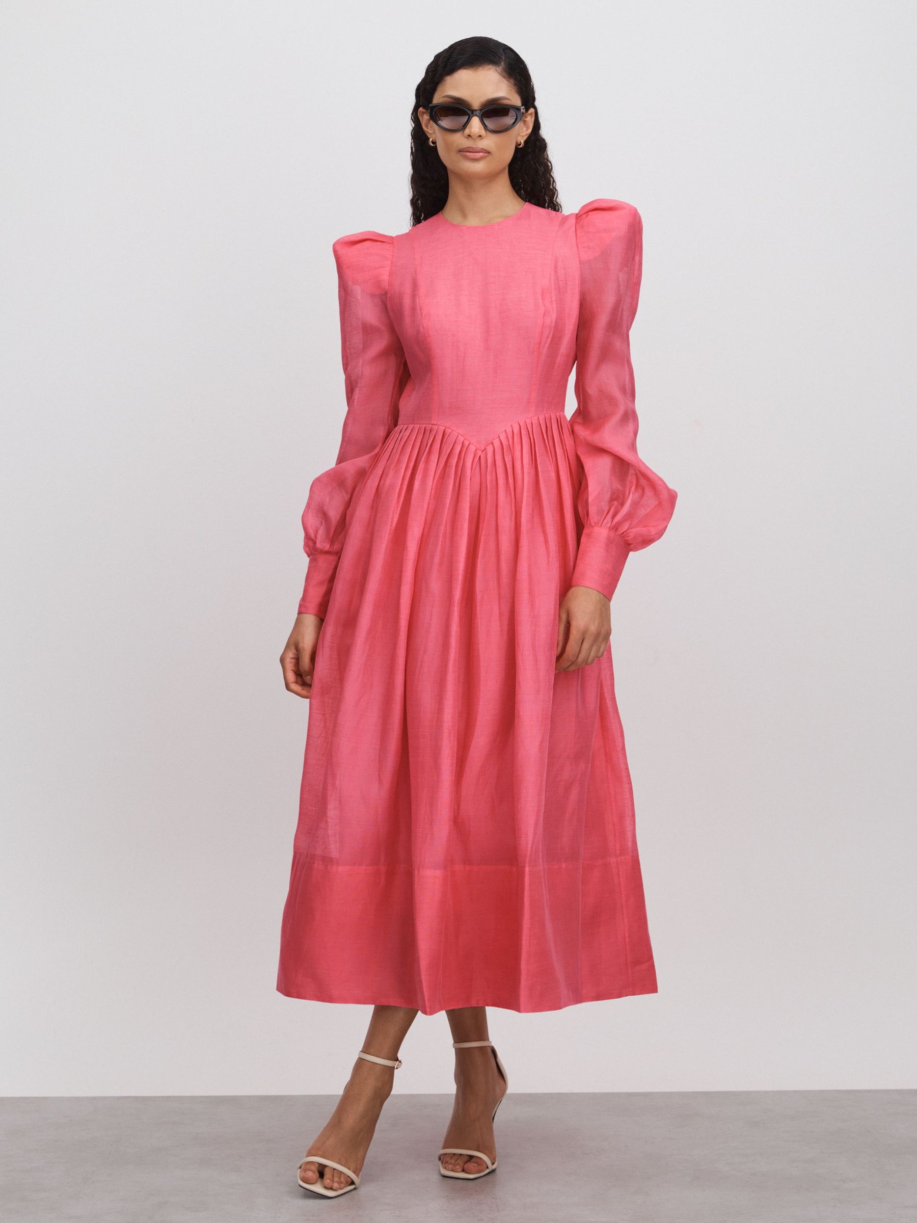 Leo Lin Silk-Linen Bishop Sleeve Midi Dress in Watermelon