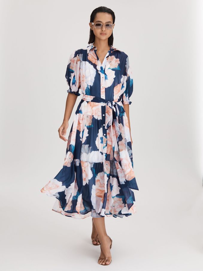 Leo Lin Printed Bishop Sleeve Midi Dress in Rosebud Print Navy