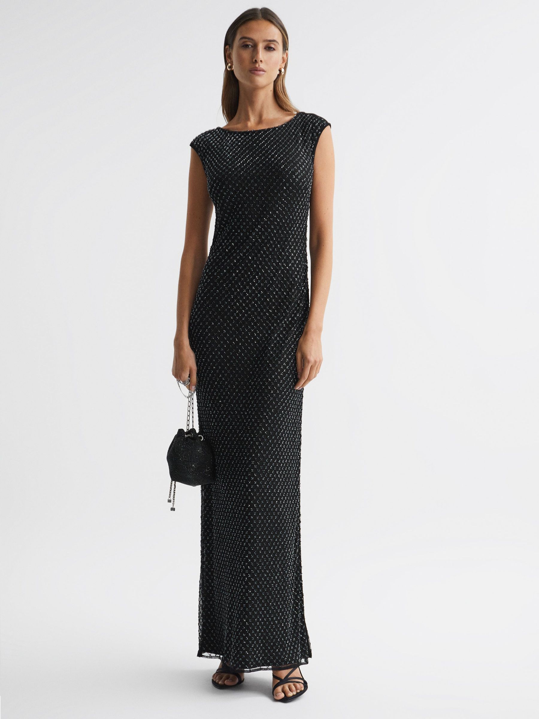 Raishma Embellished Semi-Sheer Maxi Dress in Black/Gunmetal