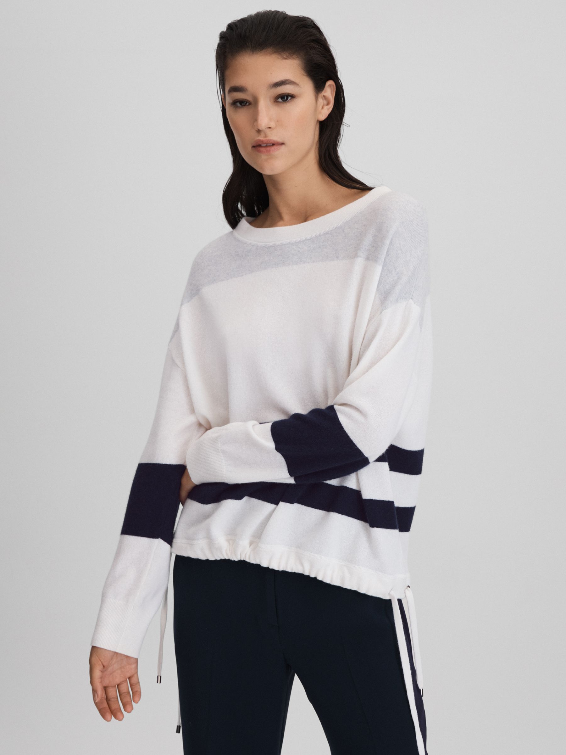 Wool Blend Striped Crew Neck Jumper in White/Grey
