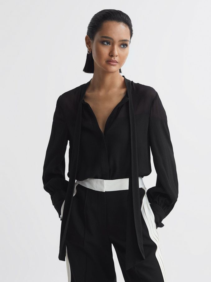 Silk-Blend Chiffon Tie-Neck Blouse in Pale Pink