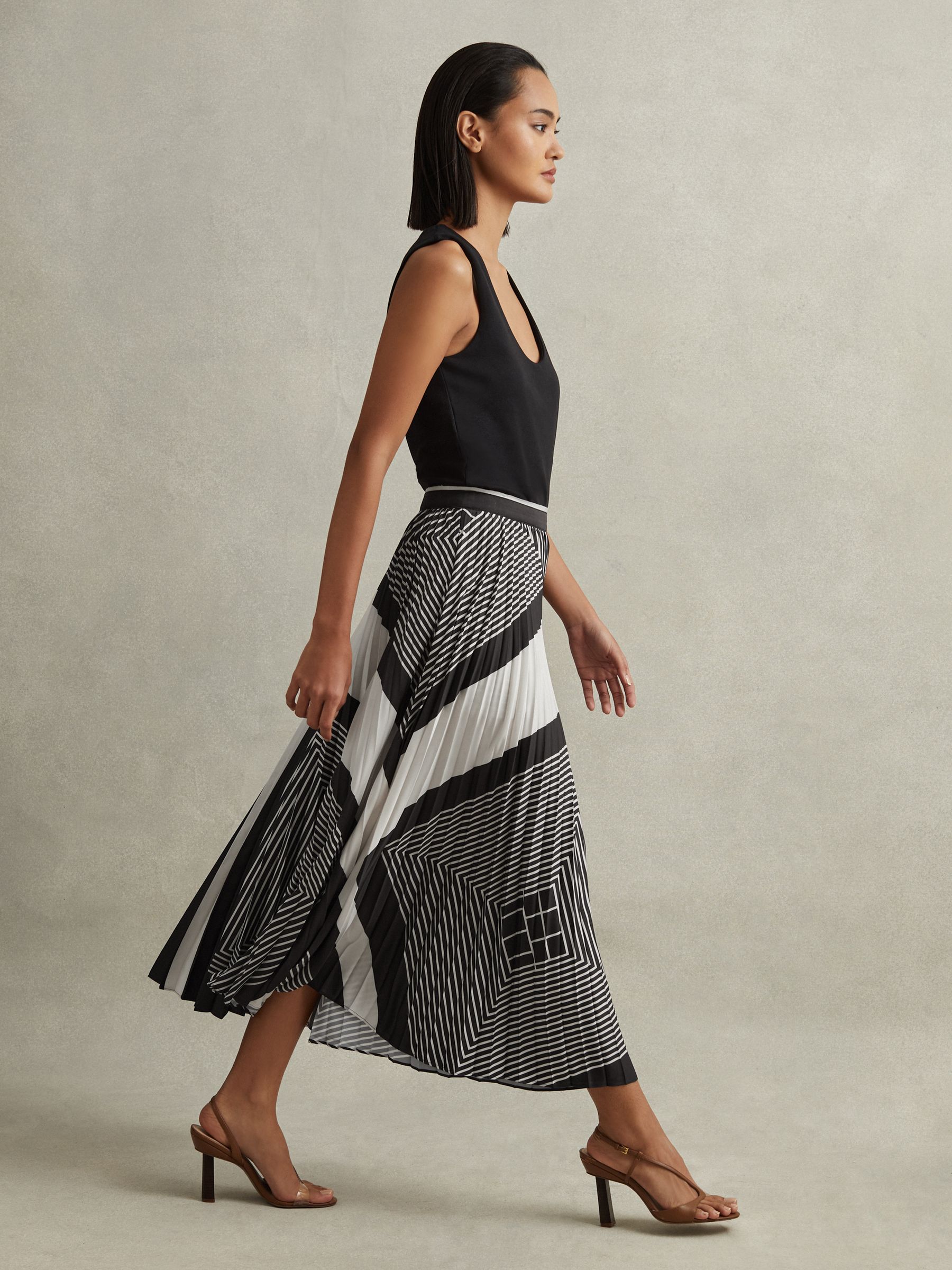 Printed Pleated Midi Skirt in Black/Cream