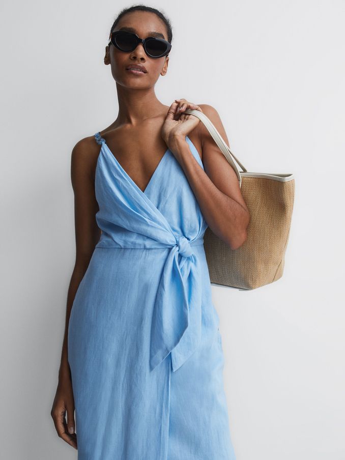 Linen Side Tie Midi Dress in Blue