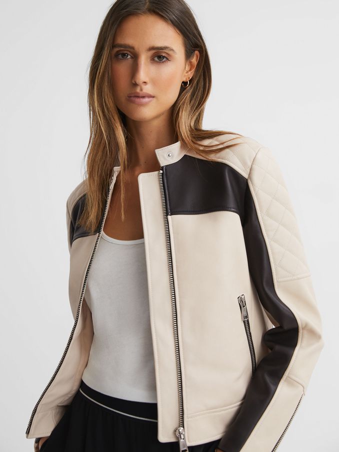 Leather Collarless Quilted Jacket in Black/Neutral