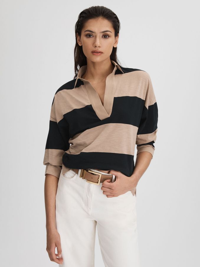 Striped Cotton Open-Collar T-Shirt in Black/Camel