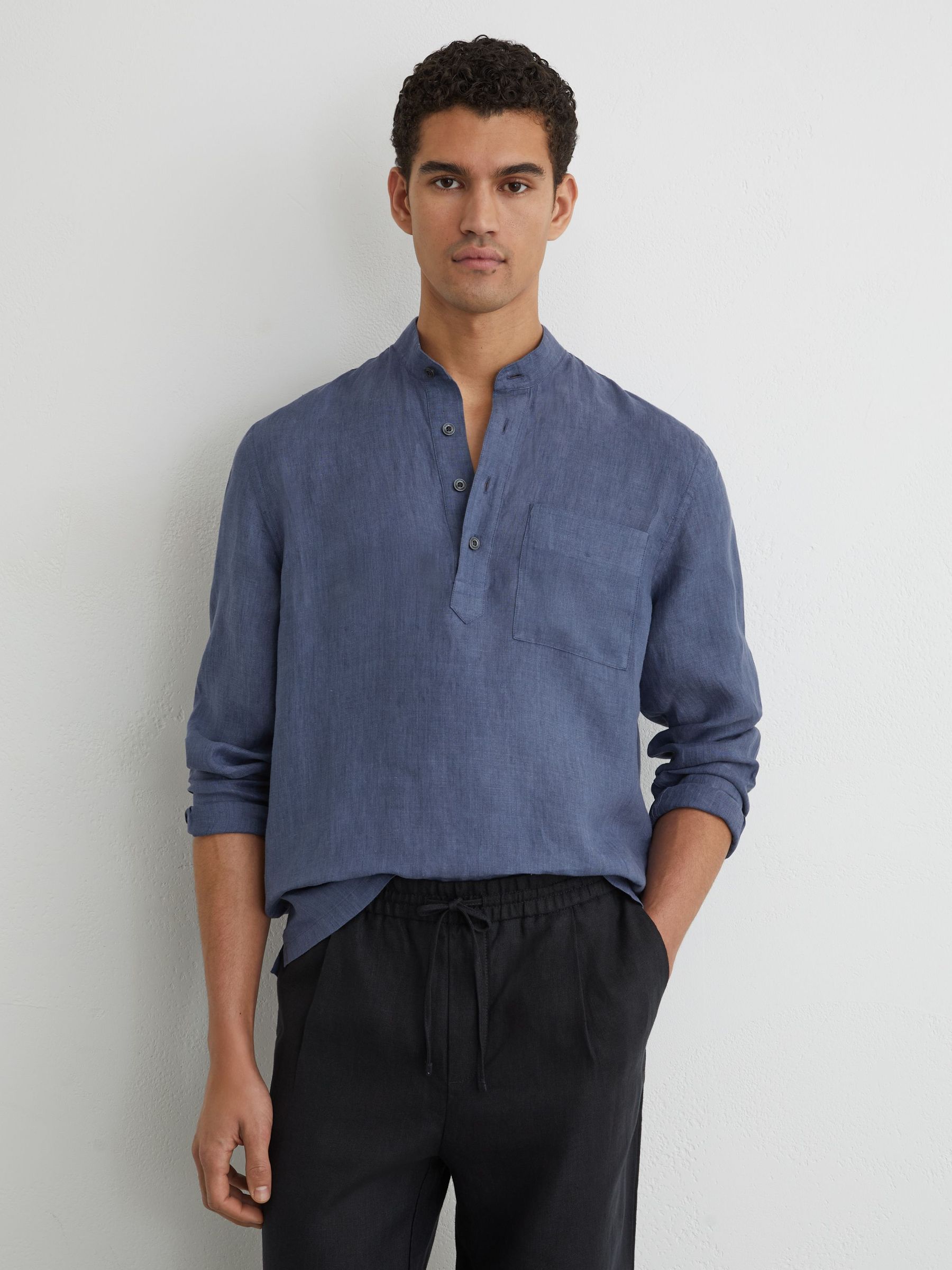 Linen Grandad-Collar Half-Button Shirt Regular-Fit in Denim Blue