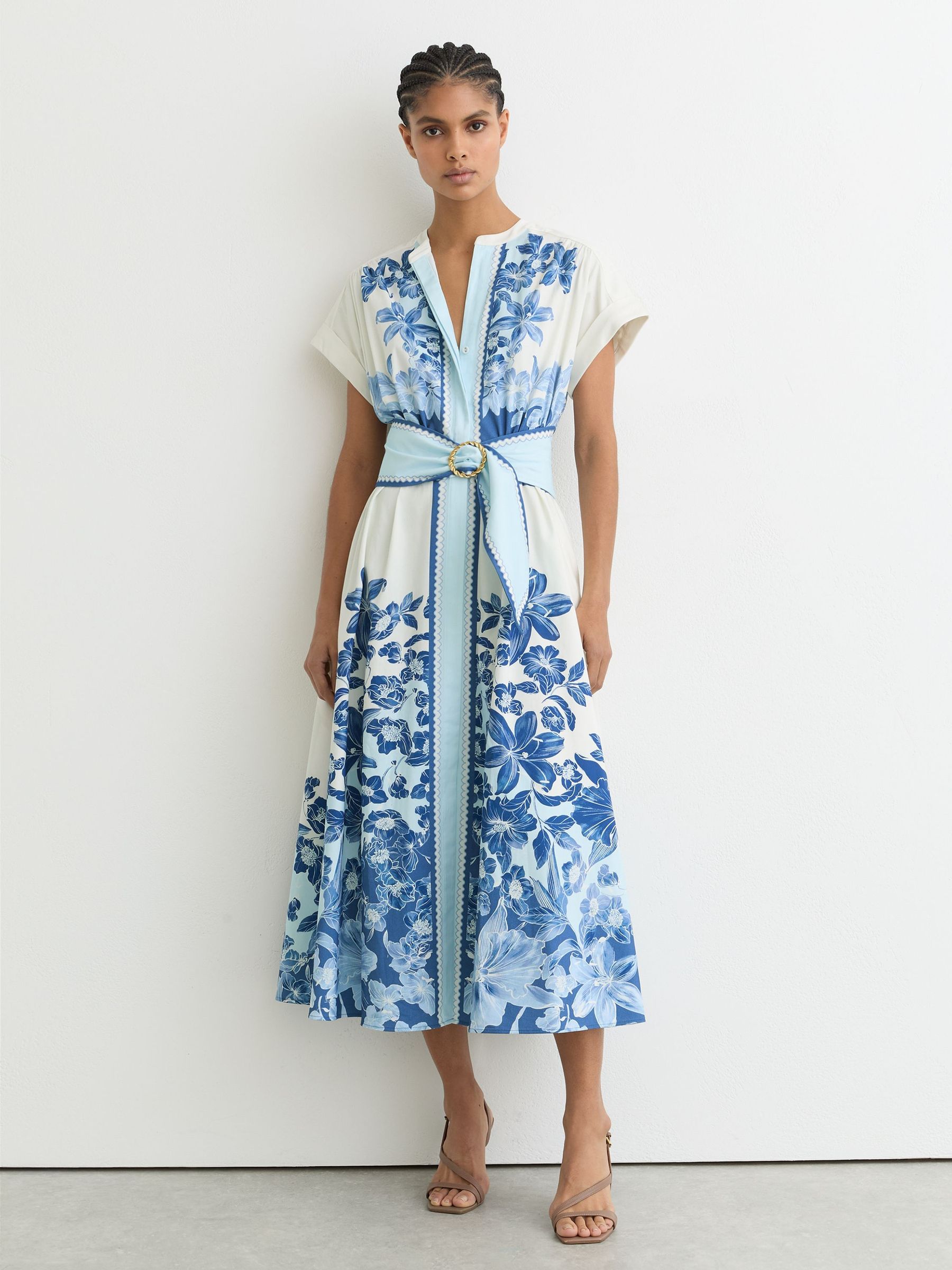 Cotton Floral Belted Midi Dress with Stretch in Blue/Ivory