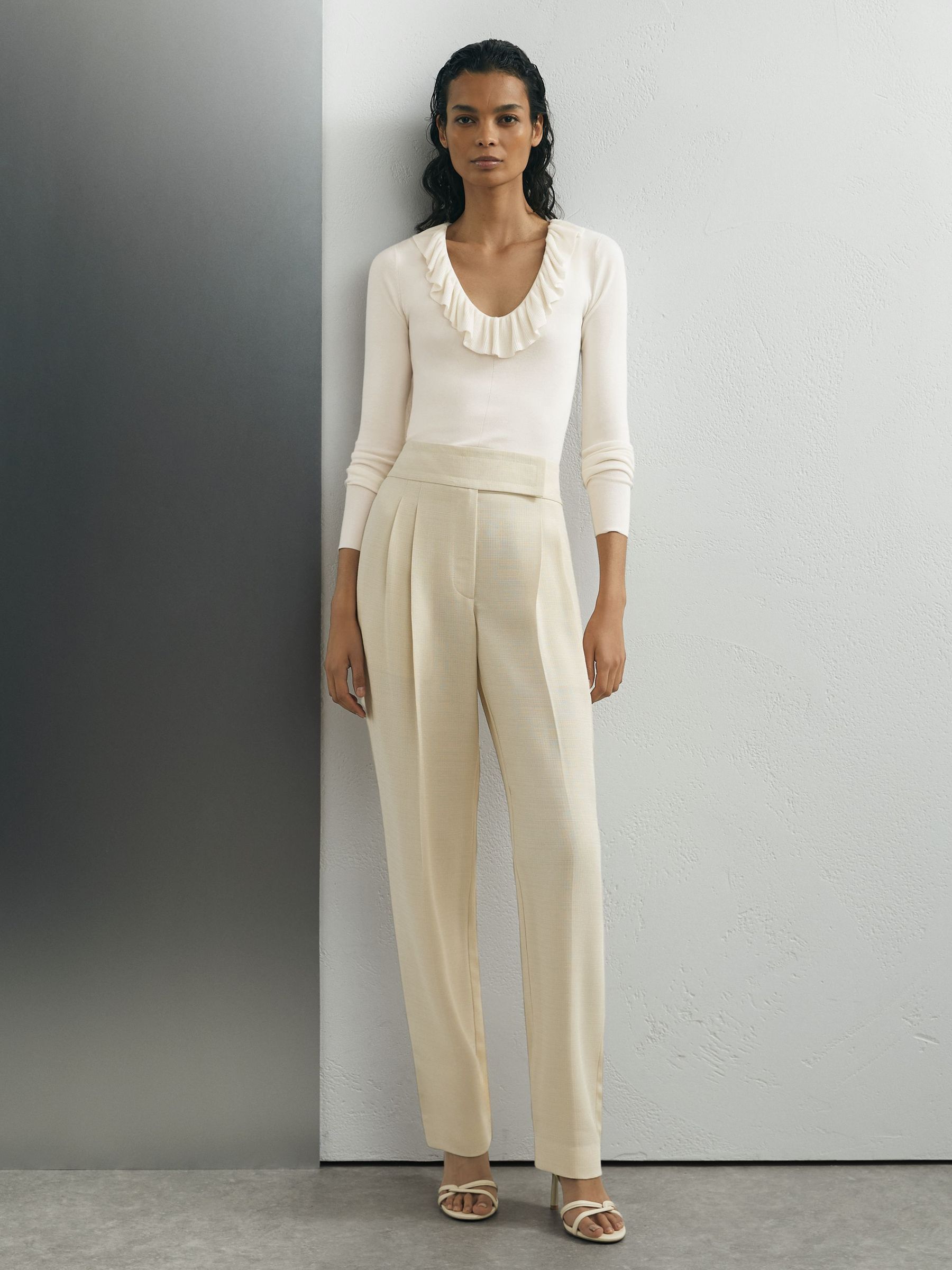 Atelier Silk Blend Ruffle Neck Knitted Off White Top in Off White
