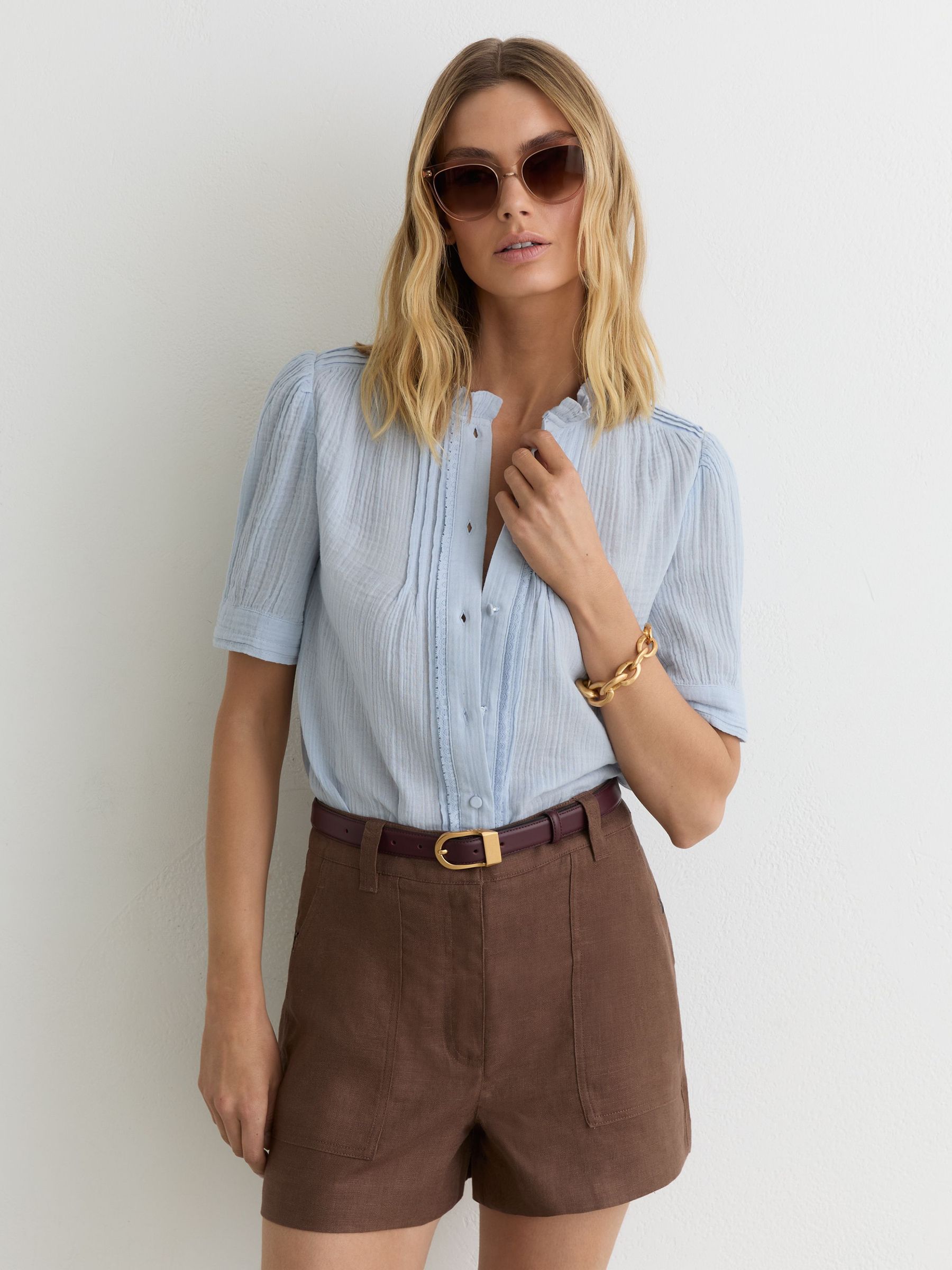 Cotton Cheesecloth Frill-Neck Top in Light Blue