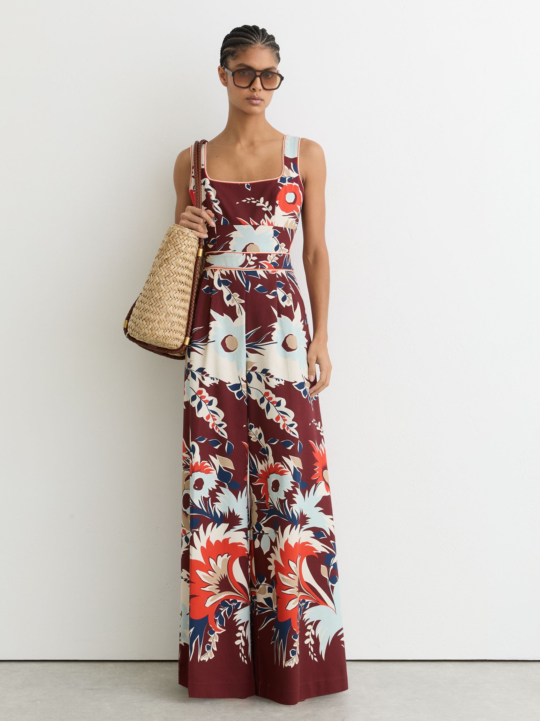 Cotton Wide-Leg Printed Jumpsuit in Burgundy