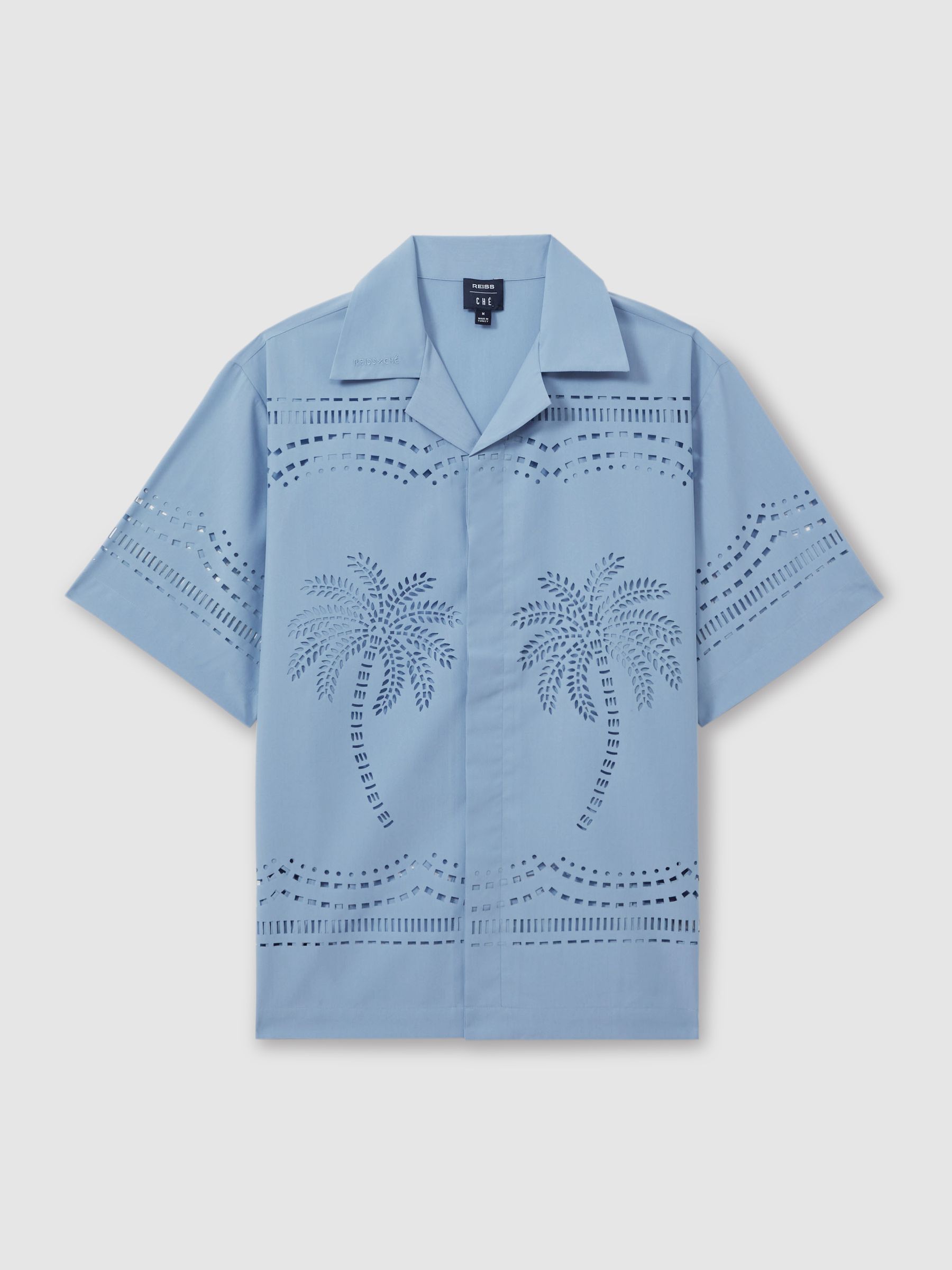 Reiss | Ché Poplin Laser Cut-Out Cuban Collar Shirt in Soft Blue