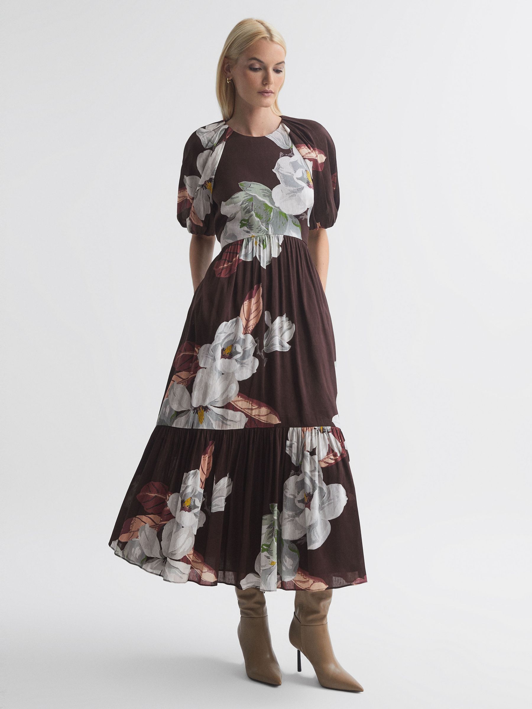Florere Linen Silk Puff Sleeve Midi Dress in Chocolate