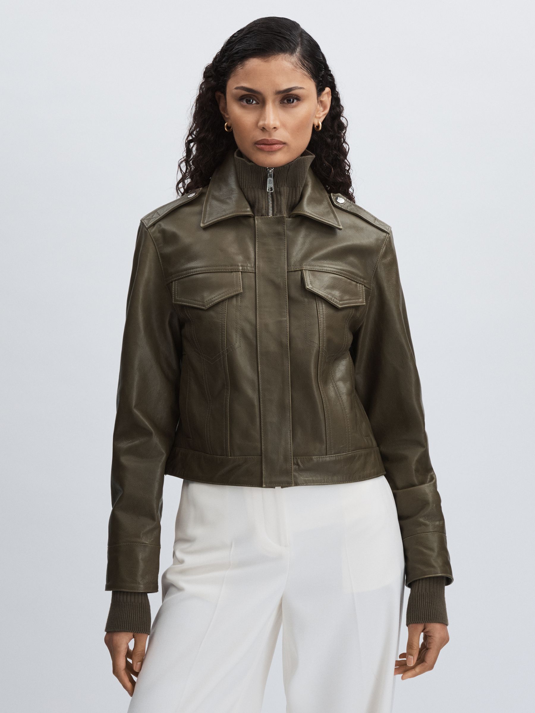 Paige Leather Cropped Bomber Jacket in Moss Green