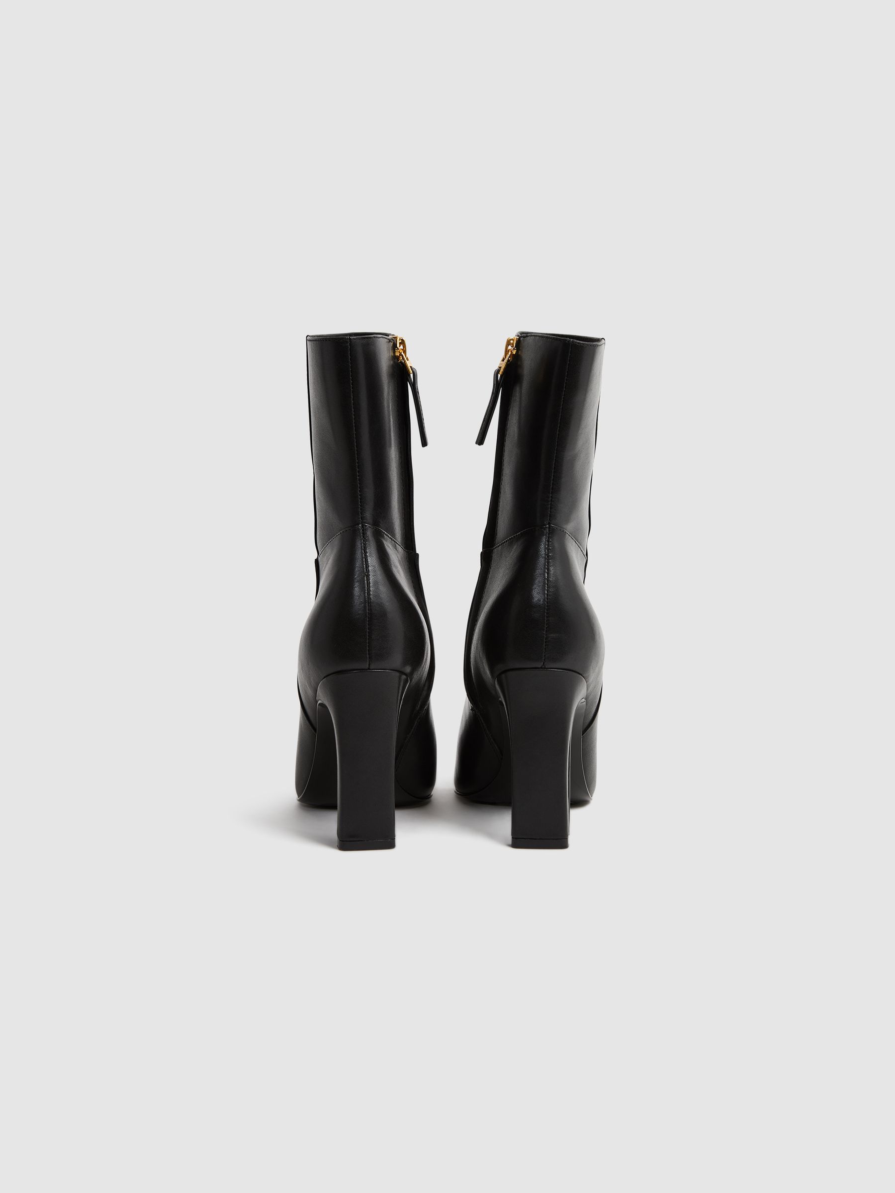 The Vanessa black ankle boots are the staple piece your transitional wardrobe is missing. Their leather construction pointed toe, and gold-tone hardware combine for a timeless, classy aesthetic. Block heels elevate the mood, lending them both to daytime wear and evening plans. 100% leather Point toe Zip closure Gold-tone hardware Block heels The model is wearing a size 6. Heel height 9.5cm.