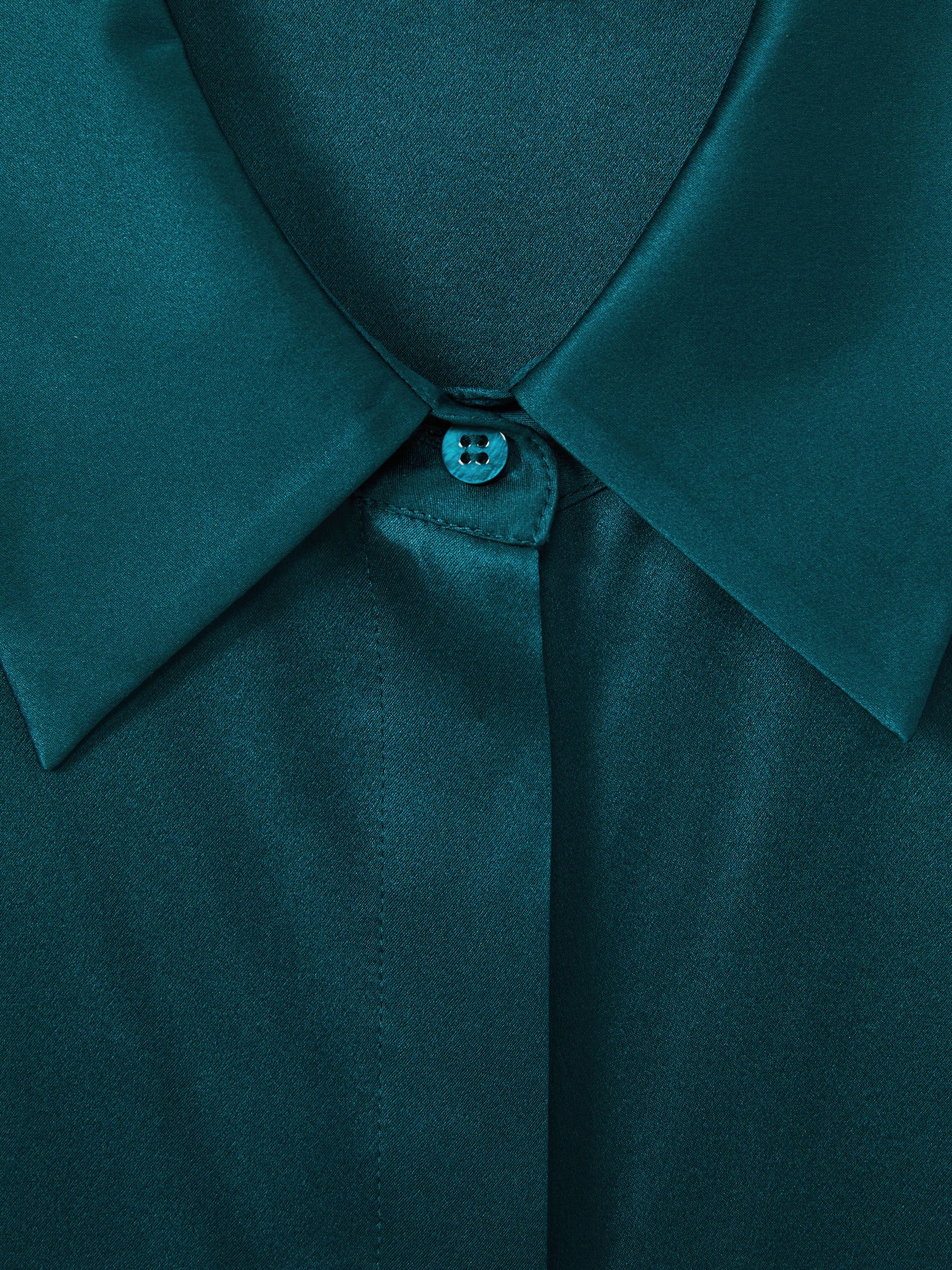 Choose the teal Hailey shirt, cut from smooth silk for a sensual feel and a luxurious look. It's punctuated by a concealed button closure and statement, oversized cuffs. 19mm silk satin fabrication Point collar Concealed button-front closure Oversized cuffs Box pleat to reverse The model is wearing a size 8. Measurements of model: Height 5ft 10'' / 177.8cm.