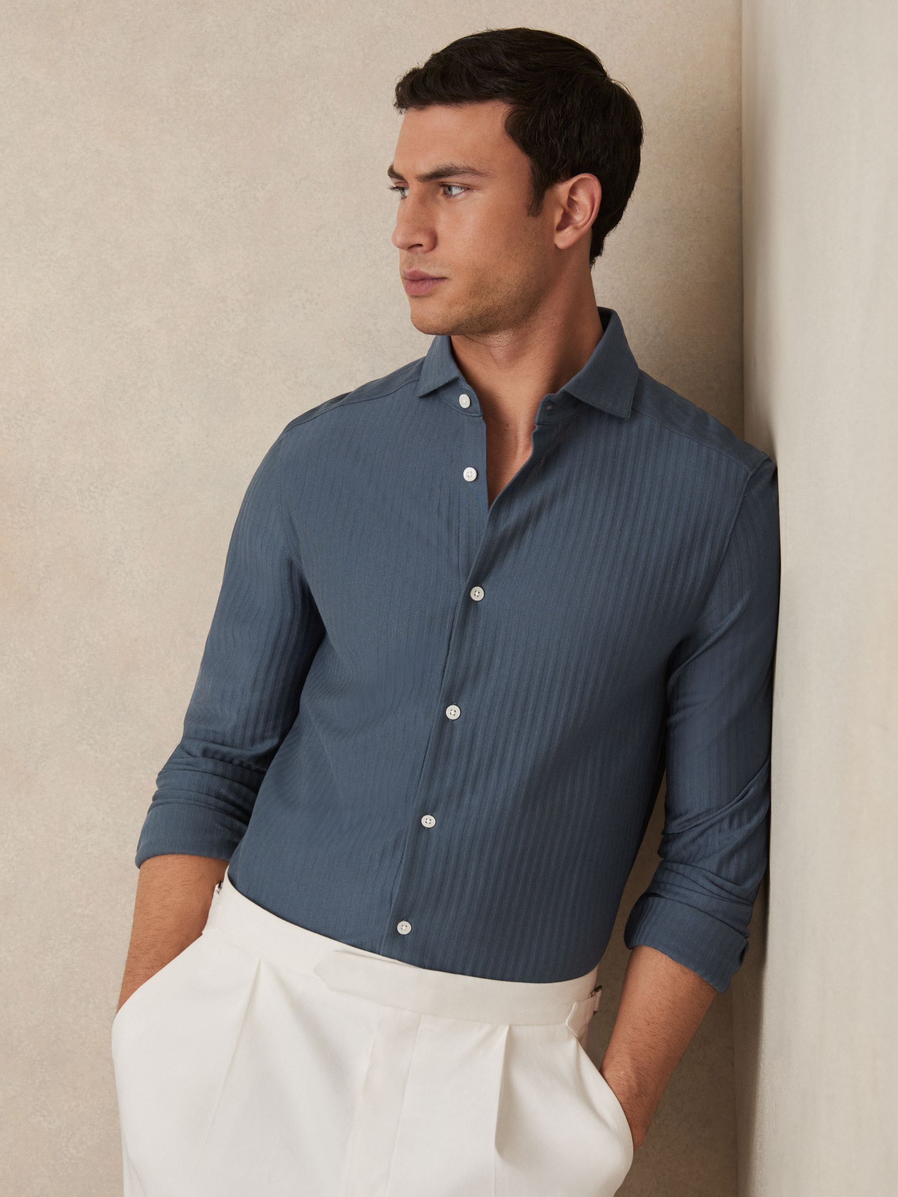 Cotton-Jersey Stripe-Jacquard Shirt in Airforce Blue