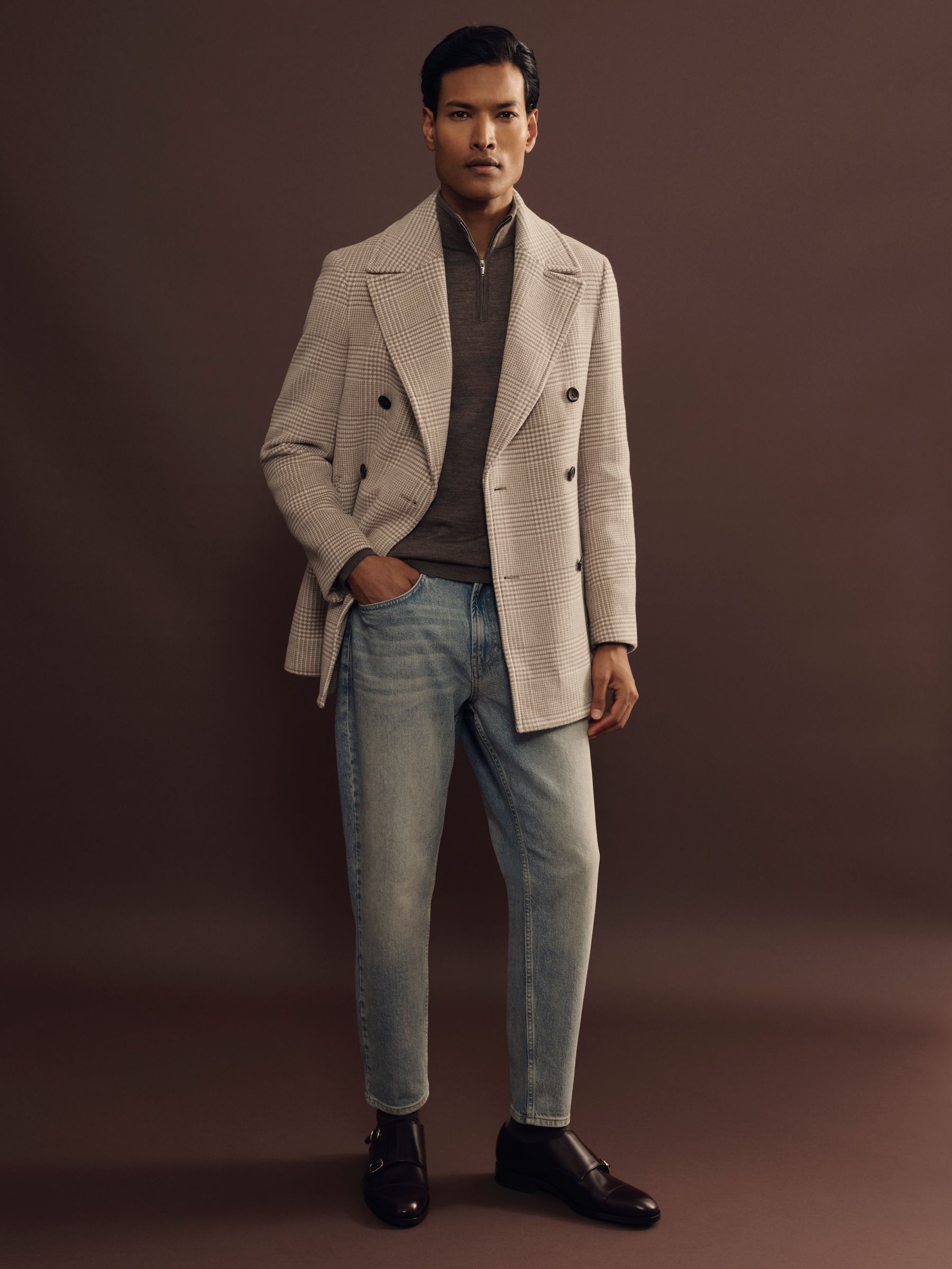 Wool Blend Double Breasted Peacoat in Oatmeal Check