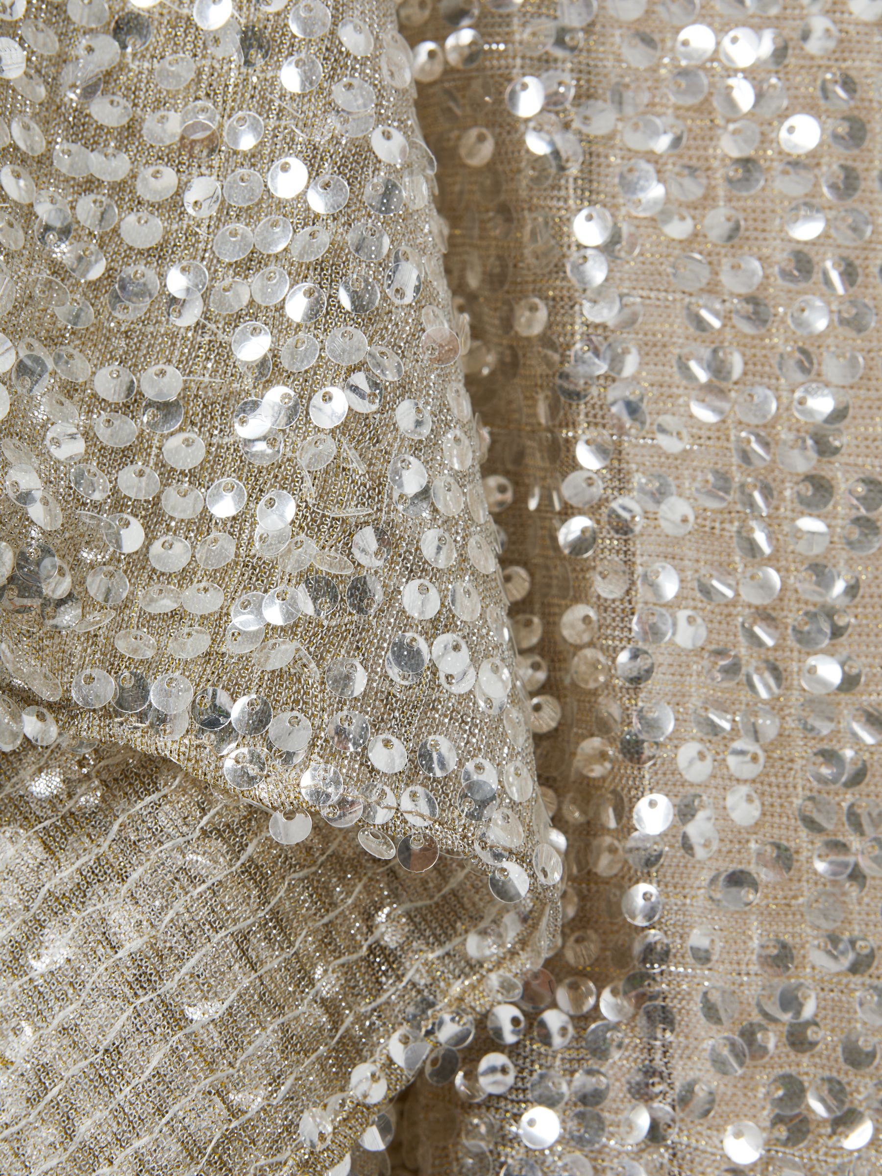 This maxi dress is tailored from a sequin fabrication into an off-the-shoulder design. Sheer, cape-style sleeves drape the body through to a floor-length finish. Sequin fabrication Off-the-shoulder design Sheer cape-style sleeves Zip-closure to reverse Maxi length Halston, curated by Reiss, is a collection of 70s-inspired modern glamour gowns that remain true to our style philosophy. Signature occasionwear styles perfectly complement your existing Reiss wardrobe. Regular side neck to hem 62" / 157cm.